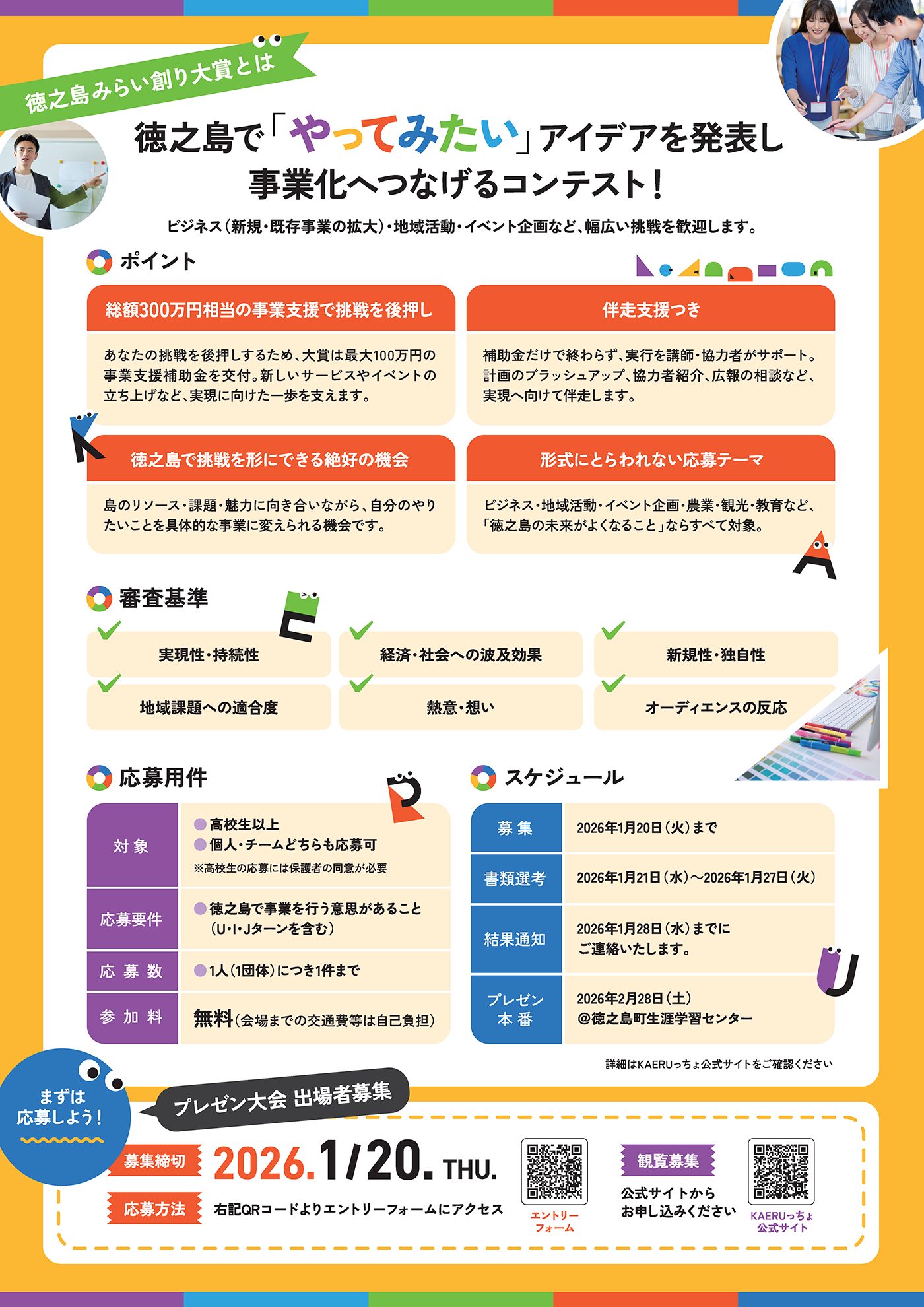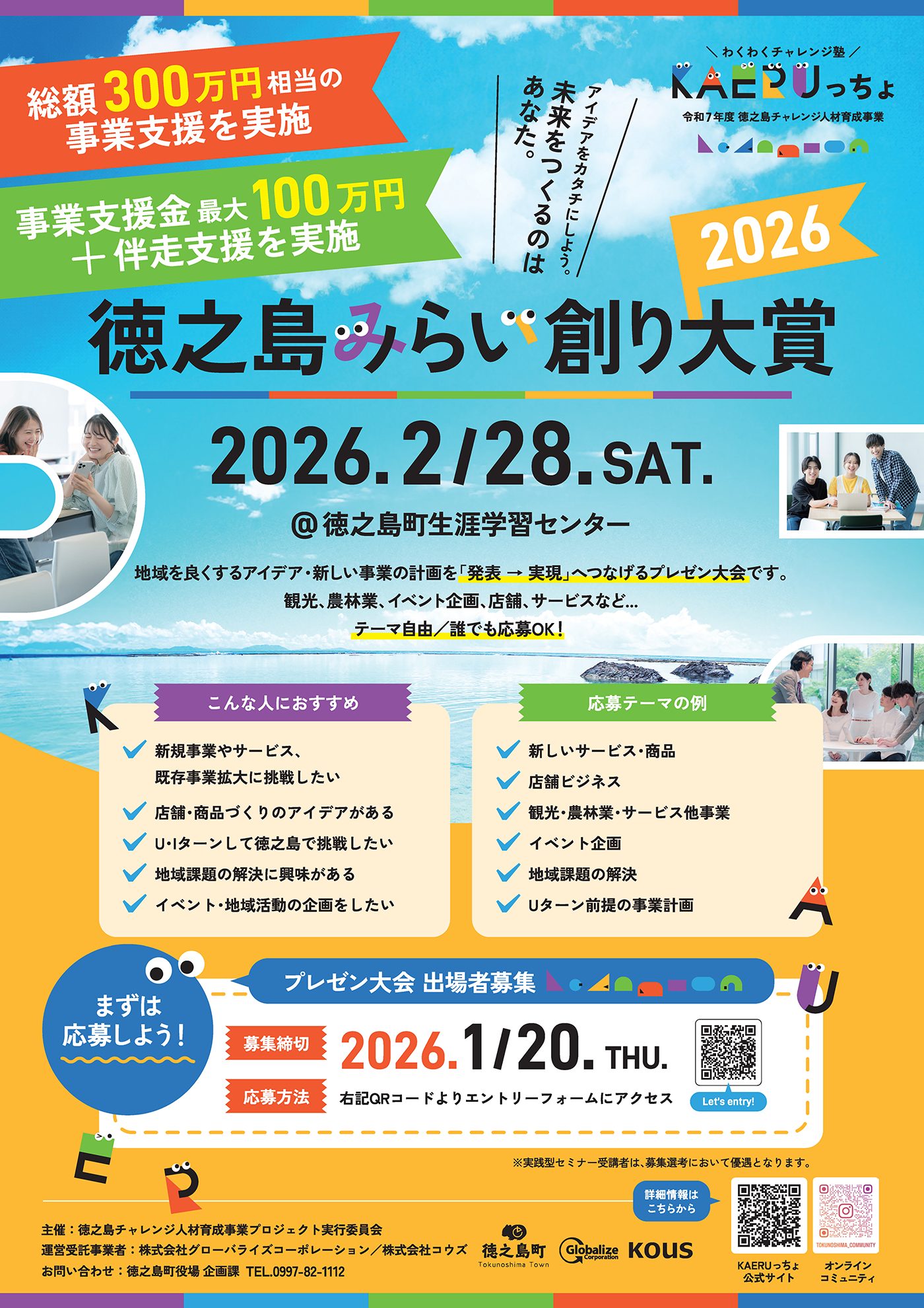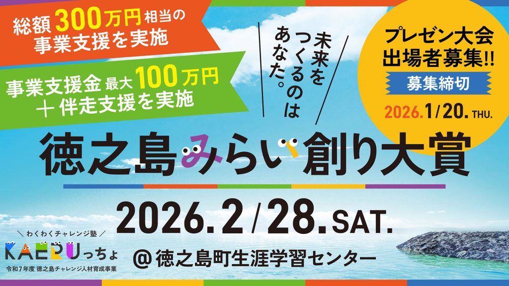 令和7年度 徳之島チャレンジ人材育成事業 「わくわくチャレンジ塾 ~KAERUっちょ~」では、 事業アイデアや事業計画を発表するプレゼン大会 「徳之島みらい創り大賞 2026」の開催が決定しました。